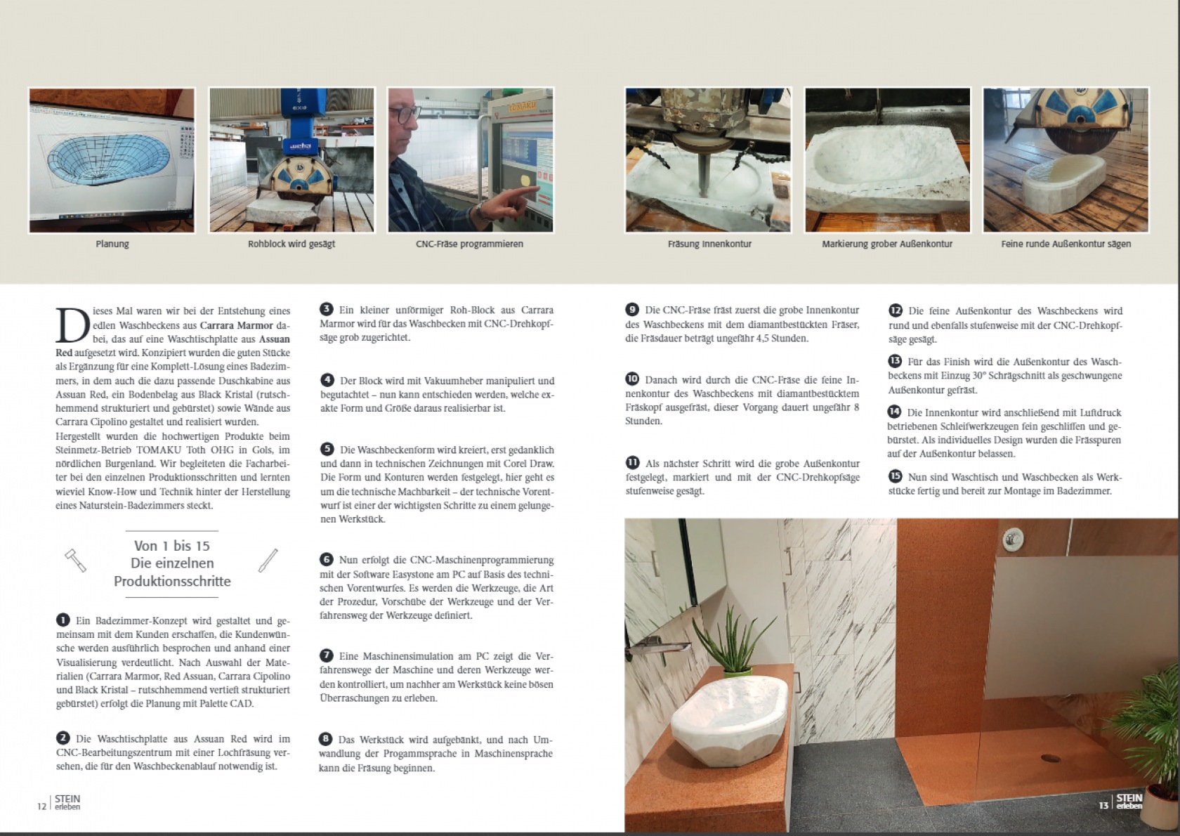 Wir haben es mit der Fotostrecke „Schritt für Schritt zum Waschbecken und Waschtisch aus Naturstein“ in die einzigartige Zeitschrift „Steinerleben“ geschafft.