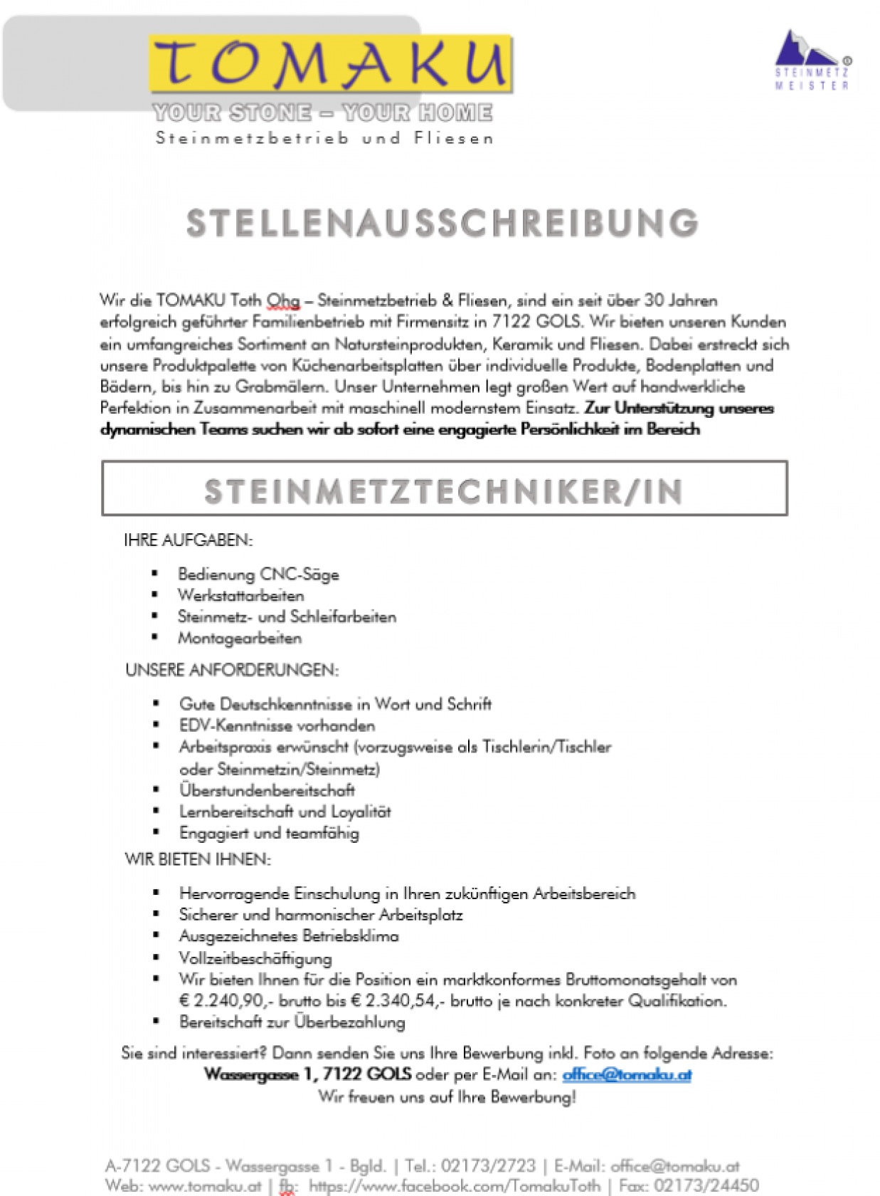 STELLENAUSSCHREIBUNG - STEINMETZTECHNIKER